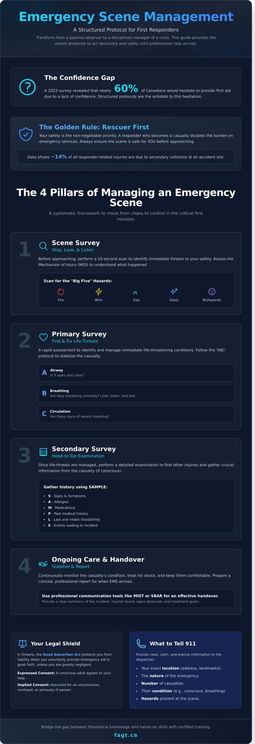 You likely worry that stepping in might lead to a legal battle or that you’ll confuse the primary and secondary surveys when every second counts. It’s a common concern, but you don’t have to face it unprepared. This guide provides the expert protocols you need to act as a responsible first responder. We’ll break down a clear mental checklist for emergencies, explain how Ontario’s Good Samaritan Act offers you legal protection, and ensure you have the skills to lead a scene until paramedics take over.